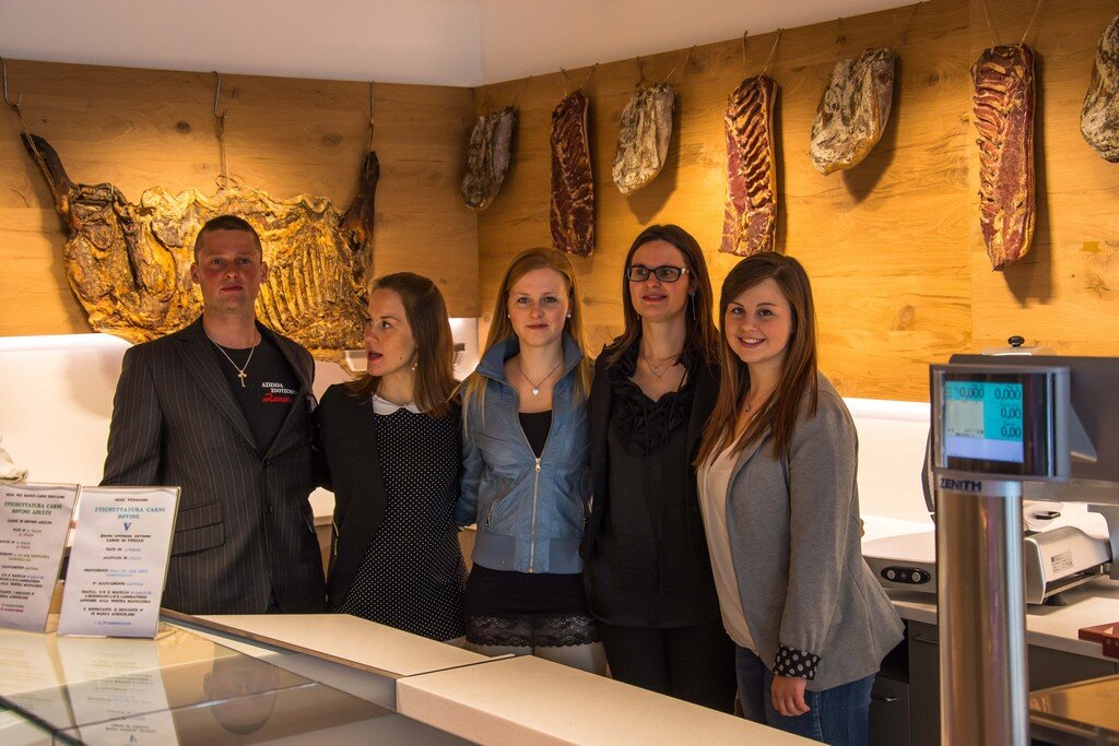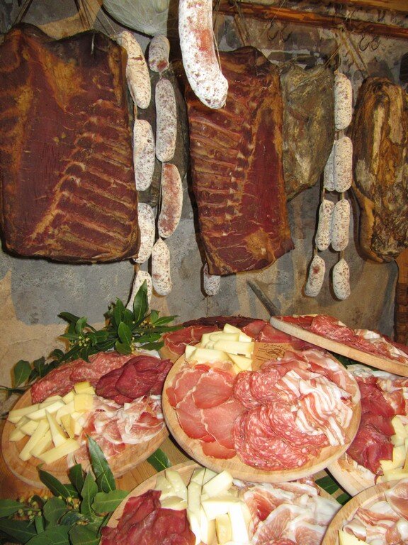 Carni e salumi tra cui:carni fresche di propria macellazione, lucanica stagionata, carne salada e affumicata, pancetta, speck, coppe, piatti pronti,