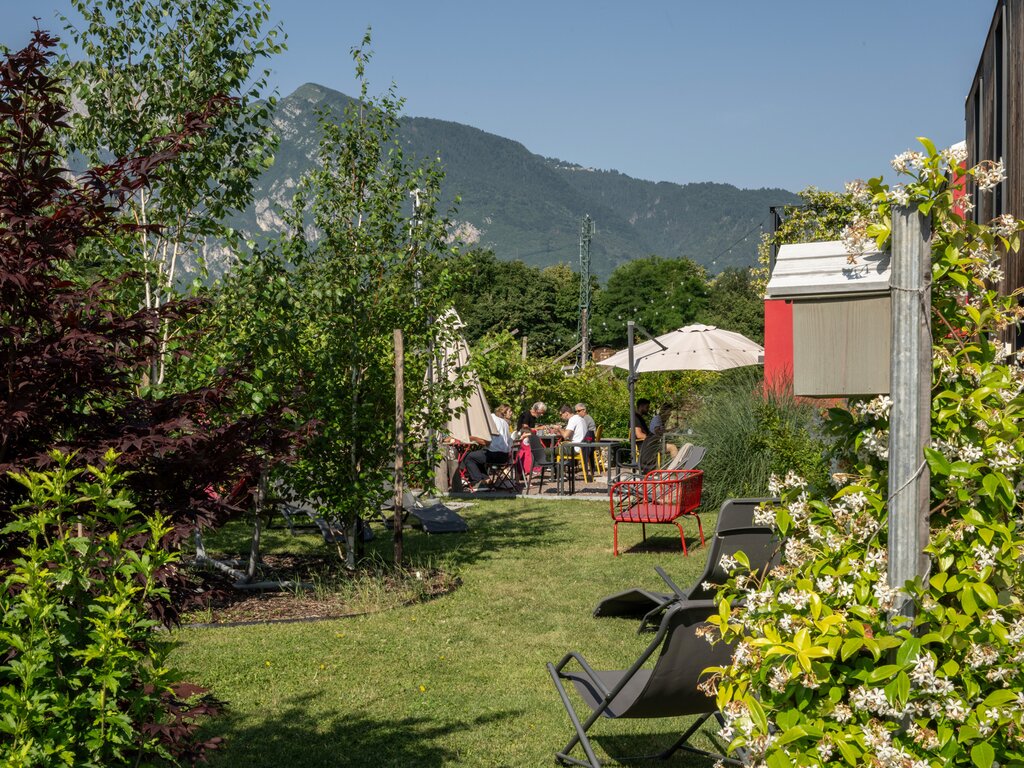 Il colore rosso che riscalda, il legno naturale che profuma e la vista su tutte le montagne che circondano Trento.