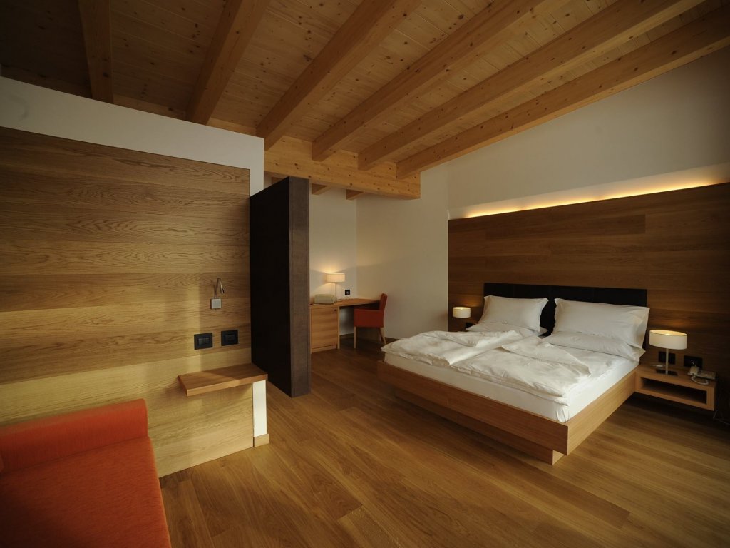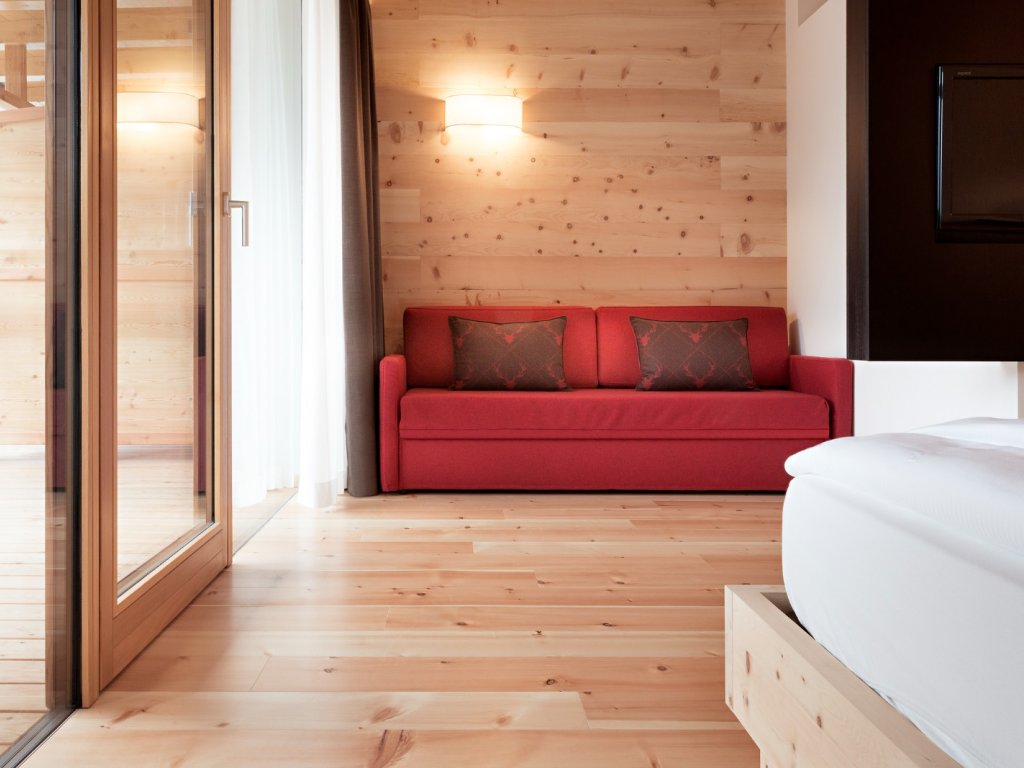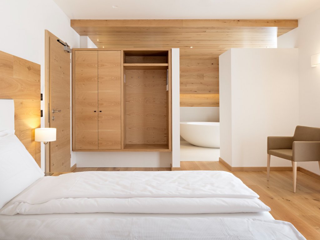 Grande attenzione anche alle 43 stanze, tra le quali spiccano le Bio Dolomites realizzate con la struttura portante in legno di abete e rivestimenti in legno di larice e rovere con grandi vetrate e ampi balconi panoramici. In tutte le stanze connessione wi-fi ad alta velocità gratuita, comoda postazione per smart-working e presa usb.