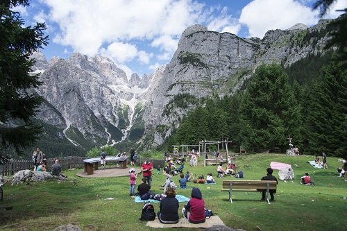 Dal rifugio si gode di una splendida vista sul Parco Naturale delle Adamello Brenta, Patrimonio dell'Unesco.