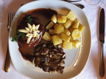 Piatti tipici a base di formaggi, funghi e selvaggina. Assortimento di dolci fatti in casa a grappe aromatizzate dal gestore. Arredamento caratteristico inlegno con animali imbalsamati. Possiblità d'alloggio con ampio parcheggio.