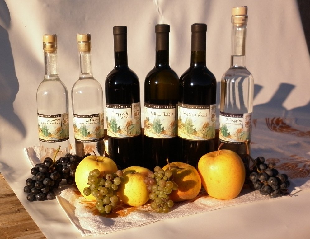 On our farm, we grow apples and, in the best exposed areas, grapes as well. From the processing of fruit we grow on our farm, we produce precious Groppello wine, apple distillates, apple juice and cider and a variety of different jams. In order to enhance our products, we installed suitable equipment for wine making and bottling inside the old family house.