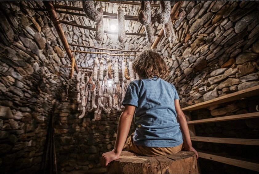 Entrerai in una grotta scavata nella montagna che viene usata per stagionare i formaggi e i salumi.