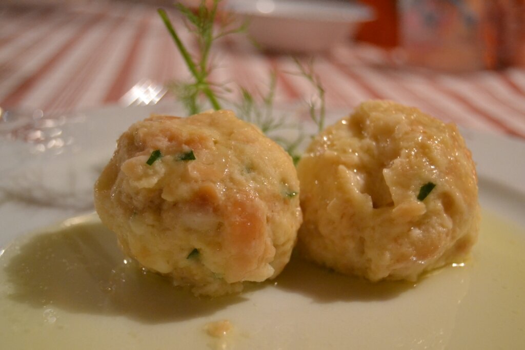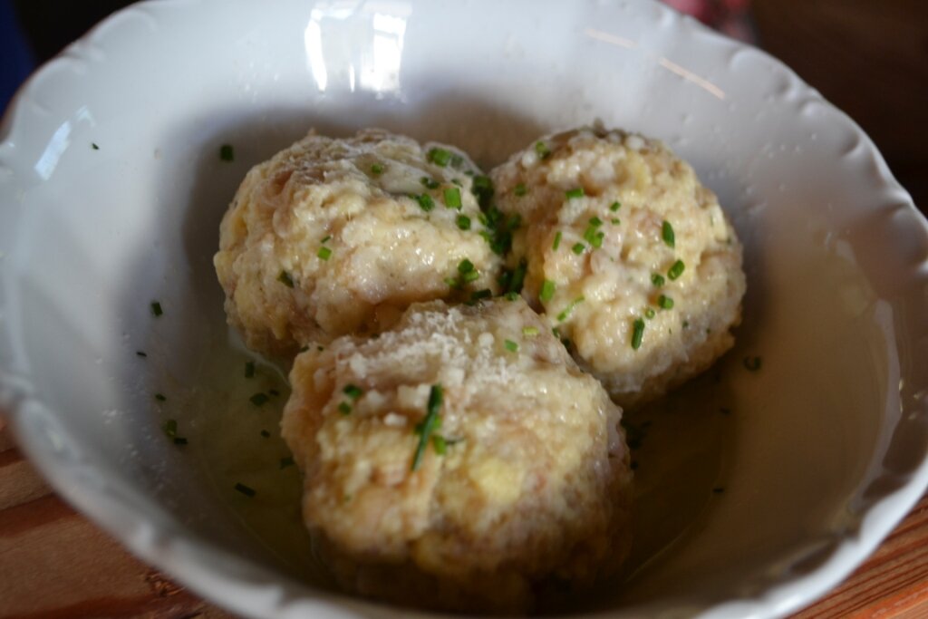 Tagliare il pane a dadini e riporlo in una terrina. Sbattere le uova con il latte e versare il tutto sul pane tagliato. Unirvi il formaggio, prezzemolo e un pizzico di sale. Lasciare riposare per 1 ora. Formare delle palline e infarinarle. Metterle in acqua salata e cucinare per circa 10 minuti. Scolare e servire con burro fuso e Trentingrana.