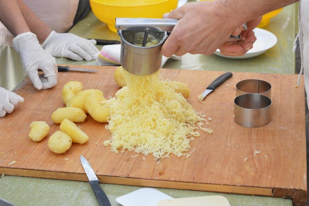 Procedere come per la preparazione dei gnocchi di patate: cuocere le patate con la buccia (al vapore o al forno). Una volta cotte, pelarle, passarle allo schiacciapatate o al passaverdura direttamente su una spianatoia di legno. Lasciar svaporare le patate, distribuire parte della farina sulle patate schiacciate, unire tutti gli altri ingredienti ed impastare velocemente.