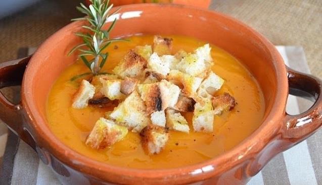 Tagliate le fette di pane a dadini e tostateli in forno a 180° per cinque minuti, dopo di che passateli in padella con un filo di olio e qualche ago di rosmarino lasciandoli insaporire bene.