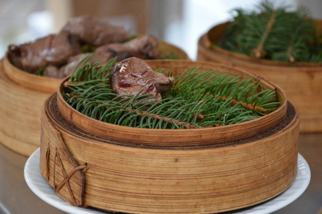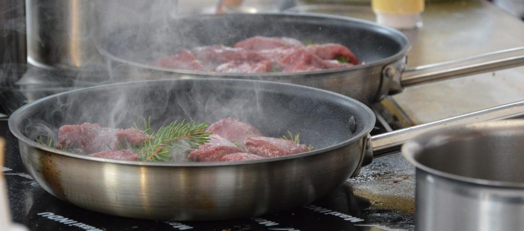 Scaldare in un pentolino l’olio con due spicchi d’aglio, ginepro e 2 rametti di gemme di abete bianco. Poi aggiungere i ritagli, nonché le eventuali ossa del cervo, e rosolare il tutto; estrarre il liquido grasso fuoriuscito dal cervo e spolverare con della farina.