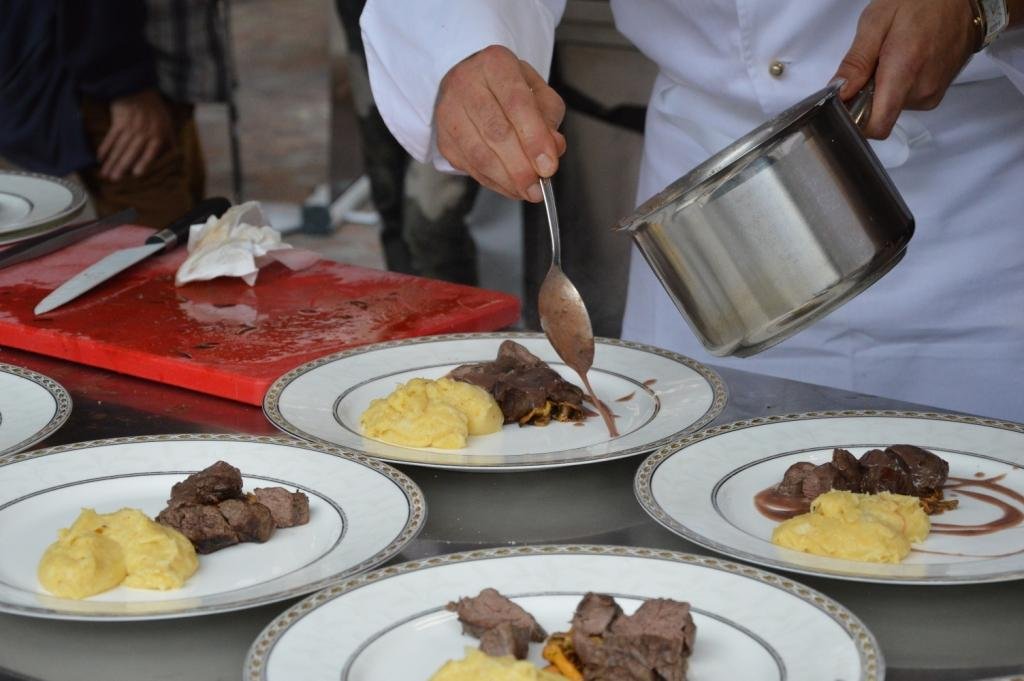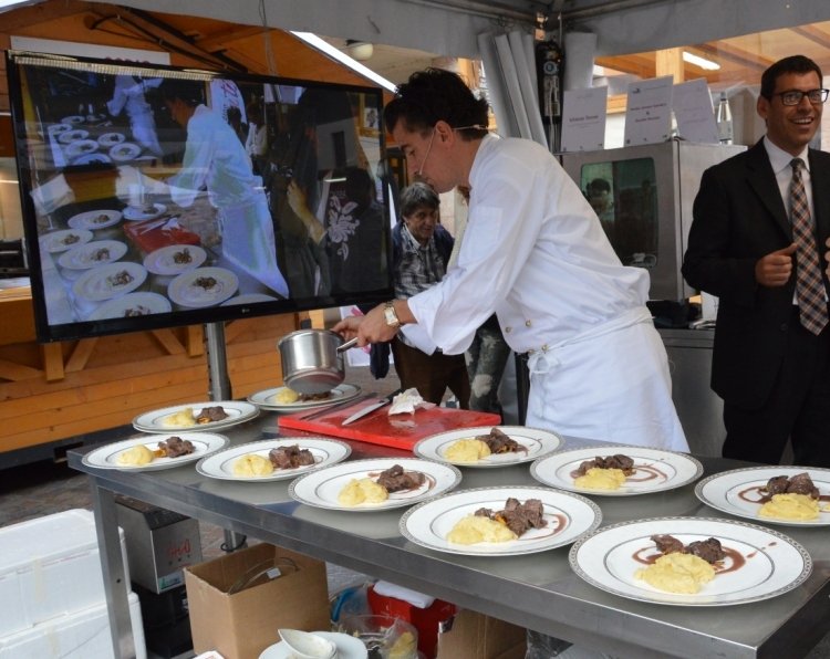 Filetto di cervo cotto con gemme di abete bianco su finferle con salsa di uva marzemina e polenta di patate