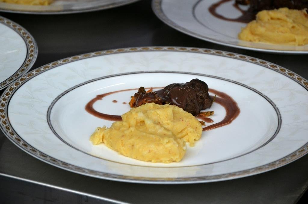 Sfumare con il Gin e con il vino rosso, lasciandoli evaporare poi ricoprire con il brodo vegetale; infornare a 180° per 20 minuti, quindi filtrare il tutto, aggiustare di sale, aggiungere il mosto d’uva marzemina e regolare la densità con della fecola di patate.