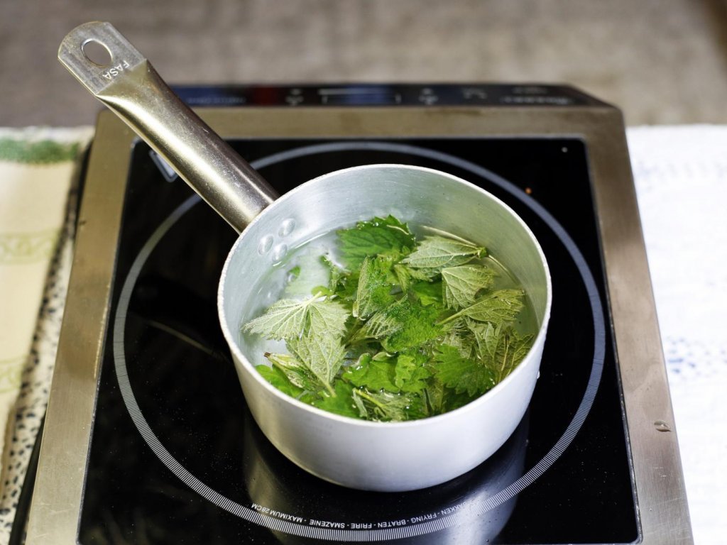 in un pentolino con acqua calda lessare le ortiche. Le ortiche vanno trattate con i guanti in modo da non essere punti.