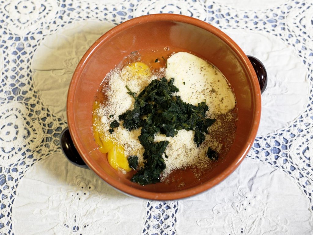 In una bacinella rompere le due uova, aggiungere sale e pepe, un filo di panna, il Trentingrana grattugiato e le ortiche precedentemente lessate.
