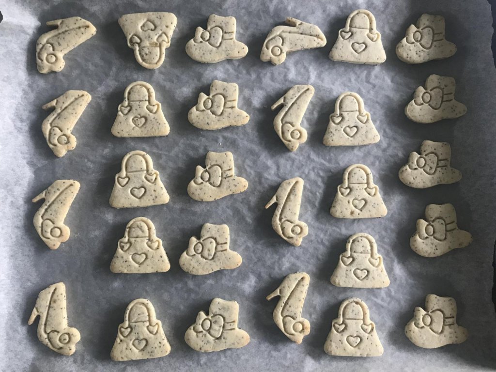 - Togliere la pasta frolla del frigorifero, stenderla e coppare con degli stampini a forma di scarpe coi tappi, cappelli, borsette oppure ritagliare la pasta frolla utilizzando delle sagome da voi realizzati sul cartoncino.
