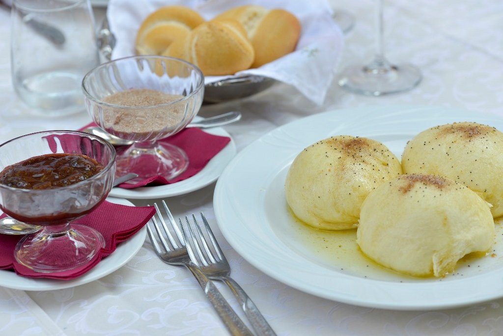 Servi gli gnocchi boemi caldi ricoperti di burro di montagna fuso, zucchero e cannella e accompagnali con confettura di prugne.