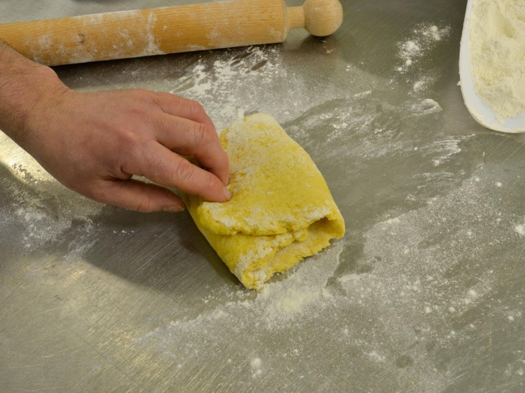 - Quando l’impasto è ben amalgamato proseguire la lavorazione su un ripiano con l’ausilio del mattarello