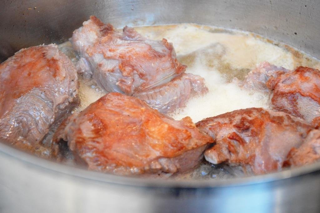 Rosolare le guancette da ambo i lati nell’olio extra vergine d’oliva, salare e pepare ed affogare nel vino, mettere un mazzetto di timo e coprire con un coperchio.