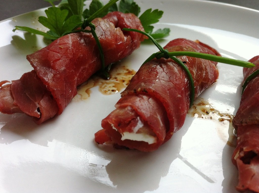 Lavorare il formaggio di capra, ottenendo un impasto morbido ed omogeneo e aggiungendo una spolverata a piacer di peperoncino. Spalmare la crema sulle fettine di Carne Salada, arrotolarle formando degli involtini e legarli con fili di erba cipollina. Conservare al fresco. Emulsionare l’olio di olio extra vergine di oliva Garda trentino DOP con l’aceto aromatico trentino, sale e pepe. Guarnire gli involtini con dell'erba cipollina e prezzemolo tritati, irrorare con la vinaigrette preparata e servite subito.