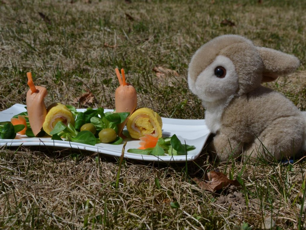 Per le antenne, realizzate due forellini sempre con lo stuzzicadenti sull’estremità dei wurstel e infilate due bastoncini di carota cruda tagliata a julienne. Potete realizzare gli occhi con due semi di papavero nero.