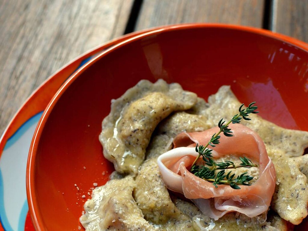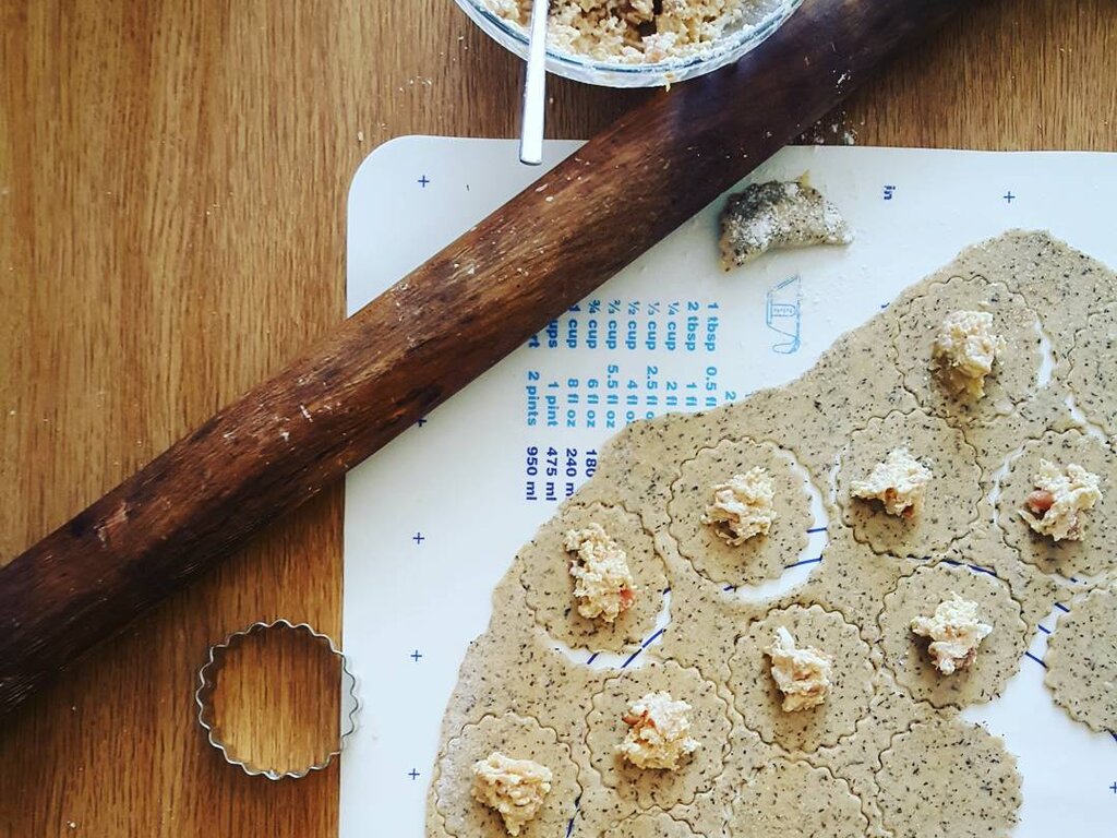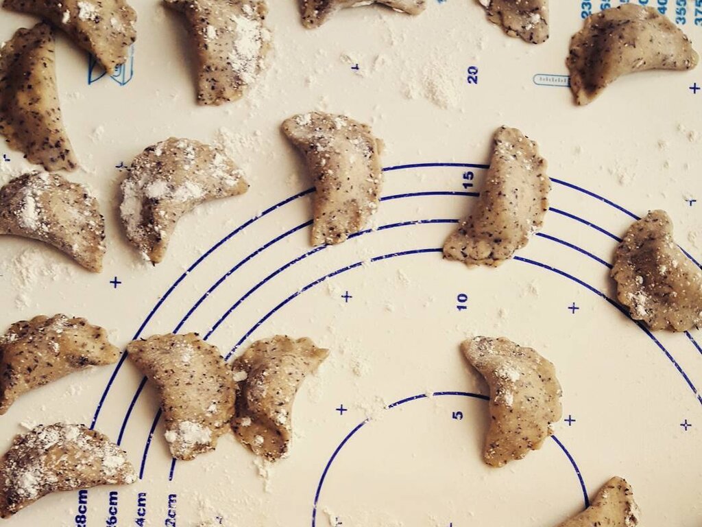 ricavare dalla sfoglia delle formine circolari, adagiare al centro un cucchiaino di ripieno, inumidire i bordi della pasta e chiudere a mezzaluna. Ripetere questo passaggio per tutte le formine. Nel frattempo porre sul fuoco una pentola con abbondante acqua, portarla a bollore, salare e versare le mezzelune che dovranno cuocere pochi minuti. Condire con burro fuso.