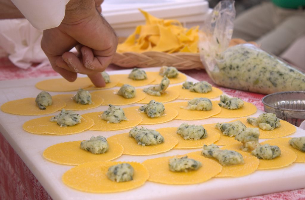 Stendere la pasta allo spessore di mezzo mm., con l’aiuto di un copa paste ritagliare dei dischi e farcire con la fonduta di formaggio, ripiegare a forma di mezzaluna e cuocere in acqua bollente.