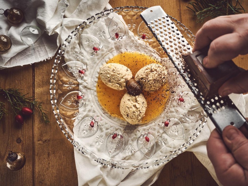 Una mousse soffice come la neve abbinata ad una fresca salsa per un dolce delle feste dai delicati contrasti e da sapori e profumi del territorio.
