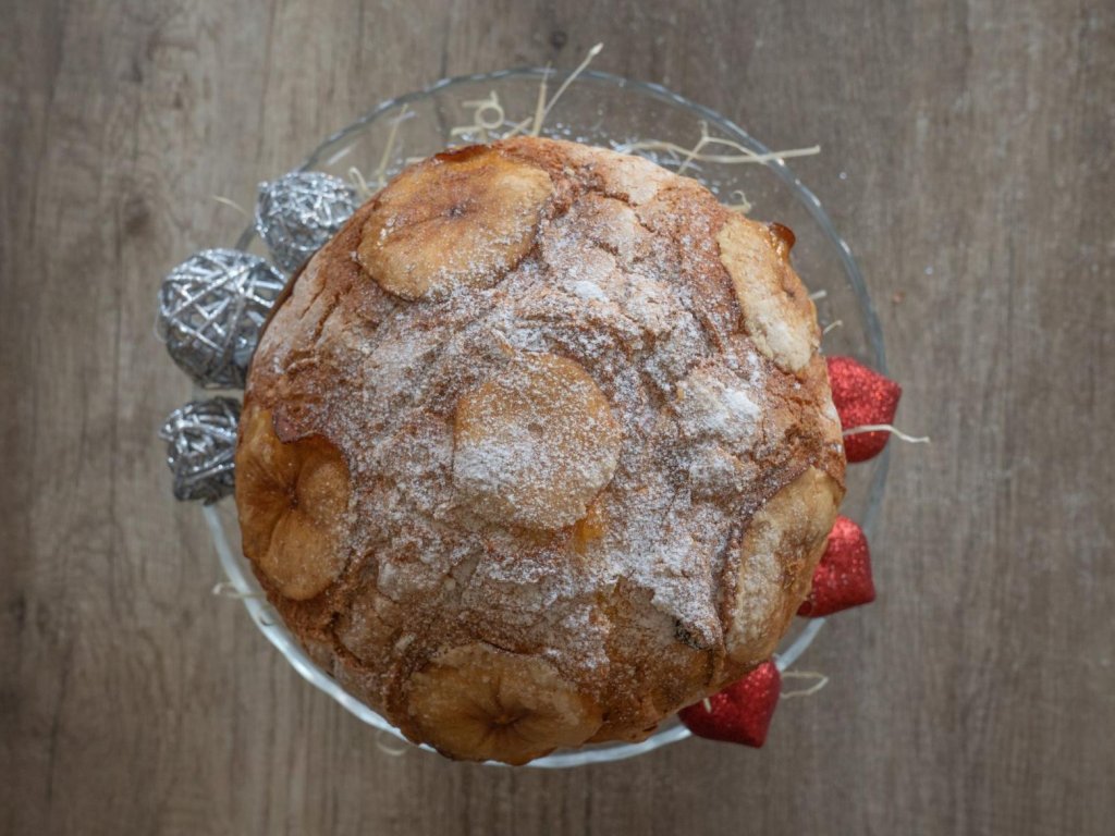 Far lievitare il tutto per 2 ore, dividere in panetti e riporre negli stampi. Mettere nelle forme e lasciar lievitare per 6 ore circa. Comporre la glassa impastando gli ingredienti e metterla sopra il pandolce unendo fette di mele sottili e lo zucchero a velo.