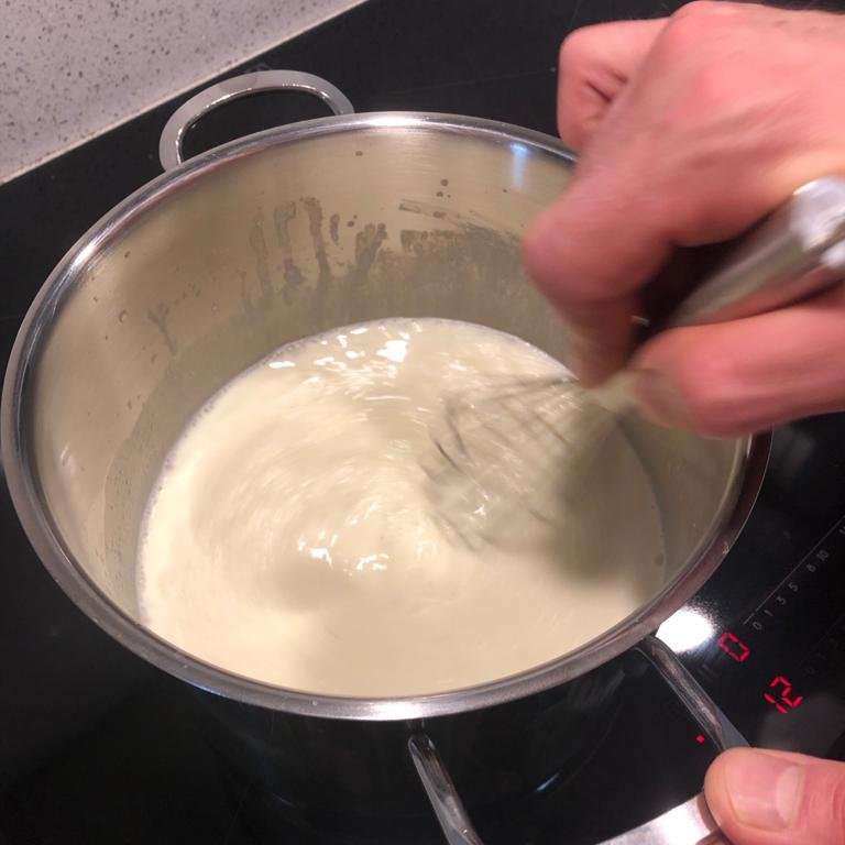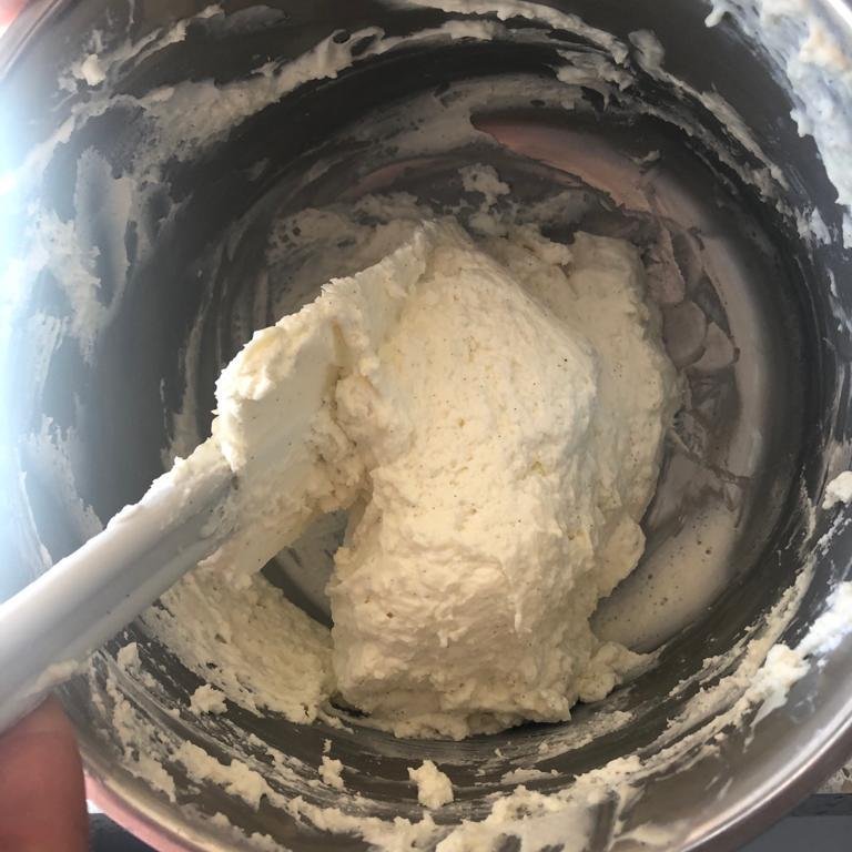 Una volta che il composto si è raffreddato, aggiungiamo la panna semimontata e per 2 ore continuiamo ogni 10 minuti circa a mescolare la nostra massa, tenendola in frigo, così da assicurare che la gelatina non scomponga i liquidi dalla panna semimontata.