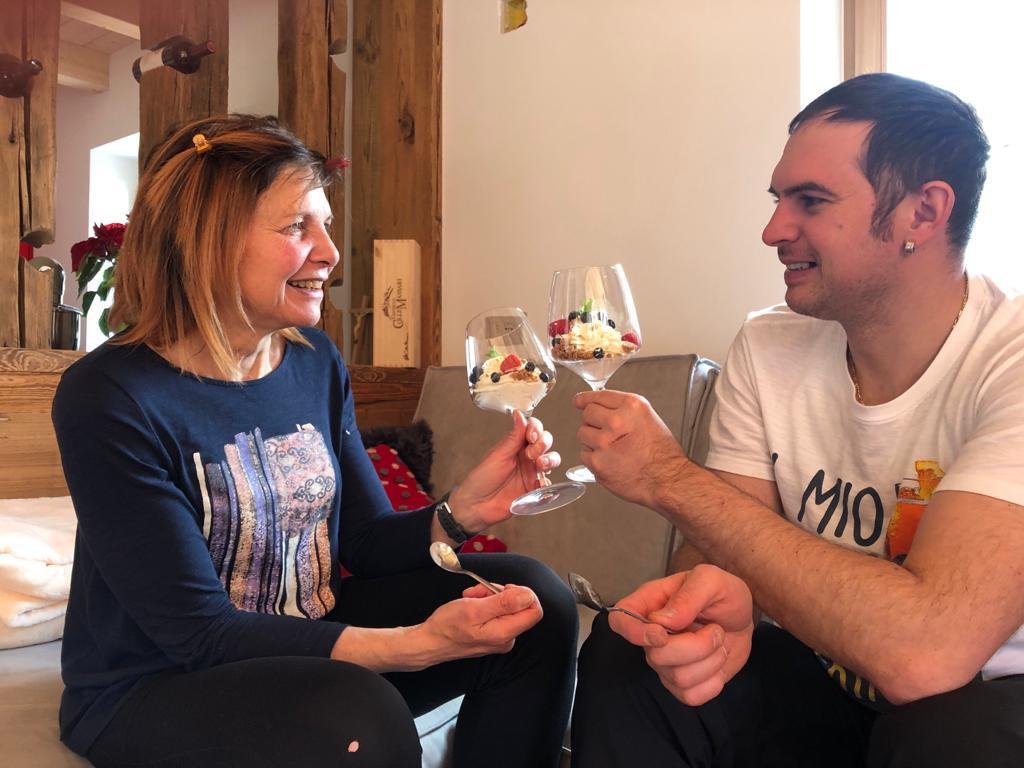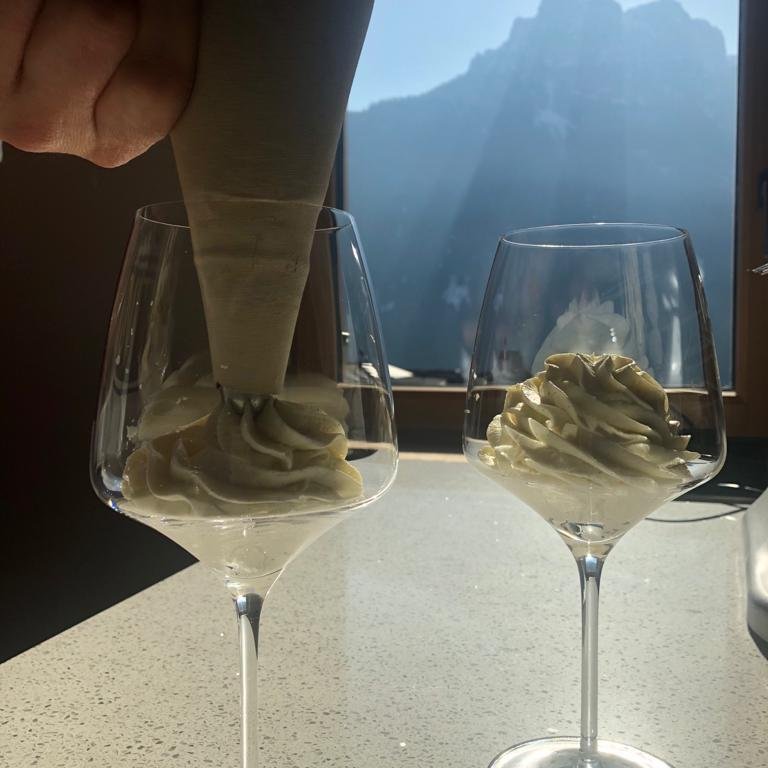 Dopodiché con l’ausilio del sac à poche andiamo a montare il nostro dessert all’interno di un calice da vino, aggiungiamo piccoli frutti di Sant’Orsola e foglie di menta.