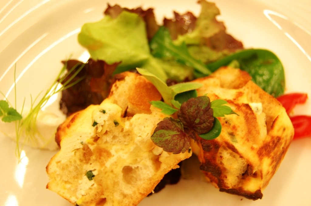 Tagliare il formaggio a cubetti piccoli e sottili e unirlo al latte, unire l’erba cipollina tagliata finemente e insaporire con sale e pepe.