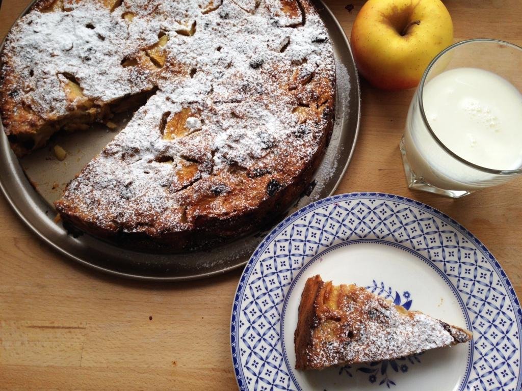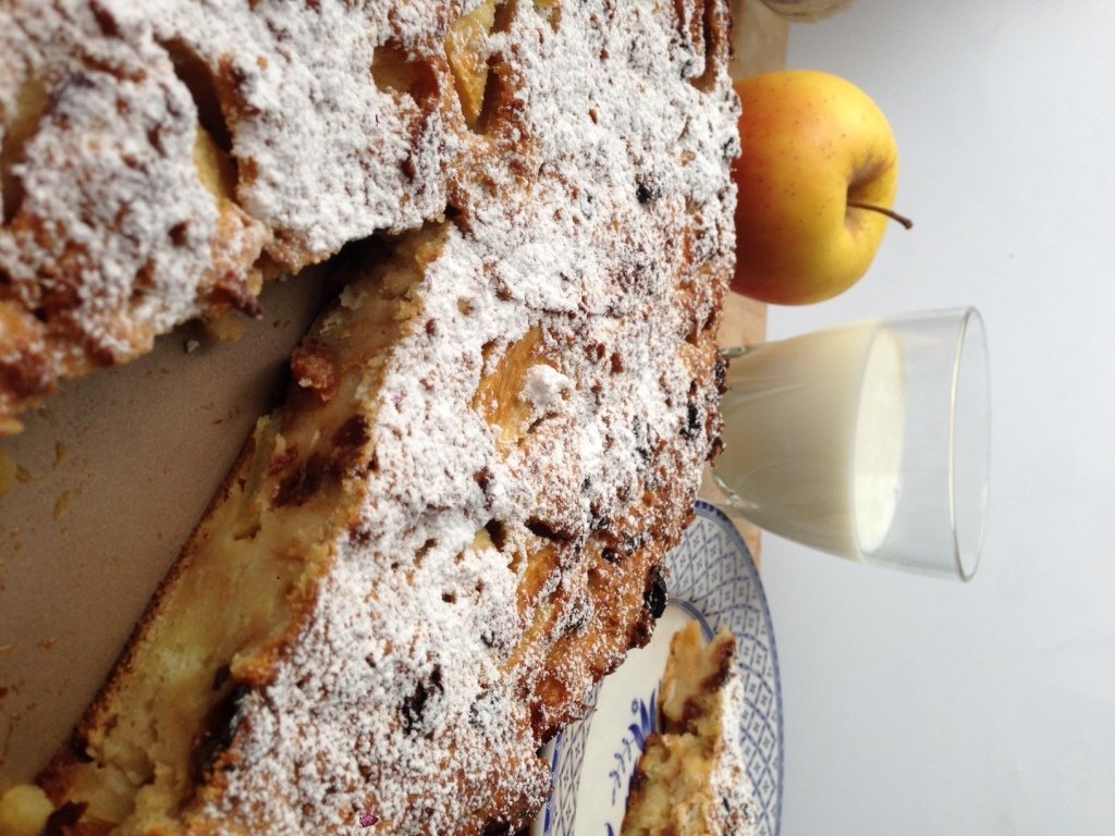 Preparazione: in una ciotola mettete il pane raffermo e bagnatelo con il latte, lasciandolo assorbire da solo per almeno 1 ora. Mettete a bagno l'uvetta sultanina in un po' di acqua tiepida (se volete potete anche aggiungere un po' di marsala od altro liquore). Sbucciate le mele e tagliatele a tocchetti, aggiungete l'uvetta ben strizzata e due cucchiai di zucchero, infine una grattata di buccia di limone. Montate due uova intere con lo zucchero. Mescolate il pane imbevuto di latte (potete usare anche le mani così di amalgama meglio), unite le mele con l'uvetta e le uova sbattute mescolando delicatamente. Versate tutto il composto nella tortiera precedentemente imburrata ed infornate a 180° per circa 45 minuti.