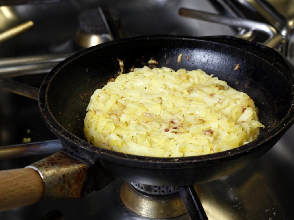 Tritate lo scalogno e fatelo stufare in una padella antiaderente (diametro 20 per una porzione) assieme alla pancetta. Aggiungete 1/4 del composto di patate e sale e pepe a piacere, date la forma rotonda e fate cuocere a fiamma non troppo alta muovendo ogni tanto la padella per staccare il tortino.