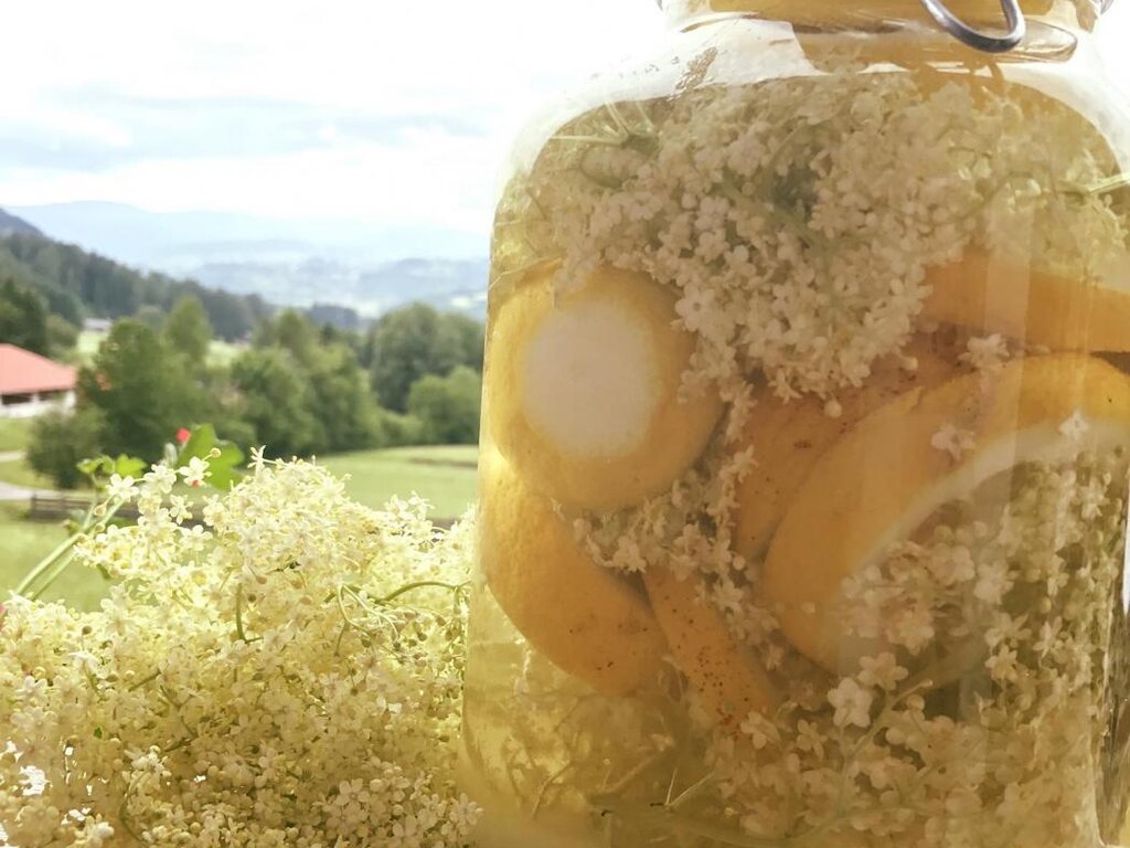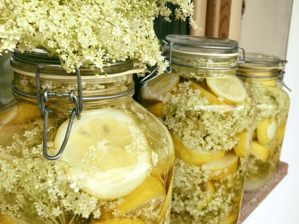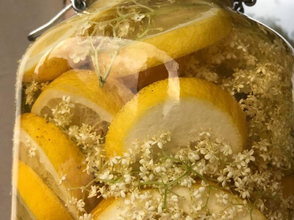 Far bollire l'acqua e lasciare raffreddare. Aggiungere 3 bicchieri di aceto di mele e lo zucchero, mescolando bene in modo che lo zucchero si sciolga. Aggiungere i fiori di sambuco ben puliti ed i limoni tagliati a fettine. Lasciare riposare al sole per 3 giorni, mescolando di tanto in tanto.