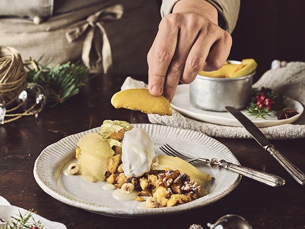 - Confettura di mirtillo rosso (o di ribes rosso) oppure mele cotte e gelato al fiordilatte oppure crema di nocciole