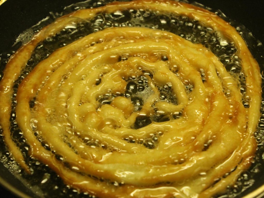 - Mettere l’impasto dentro la teiera e versare il composto nell’olio bollente, dando la tipica forma a spirale. Gli stràboi vanno poi girati appena prendono il colore dorato.