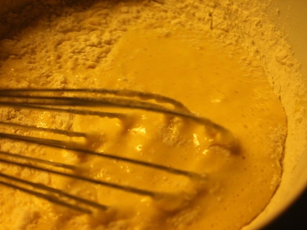 - Mettere le uova in una terrina e sbatterle bene, aggiungere poco alla volta il latte e pian piano le due farine e la birra, aggiungere infine il pizzico di sale, la grappa e la panna.
