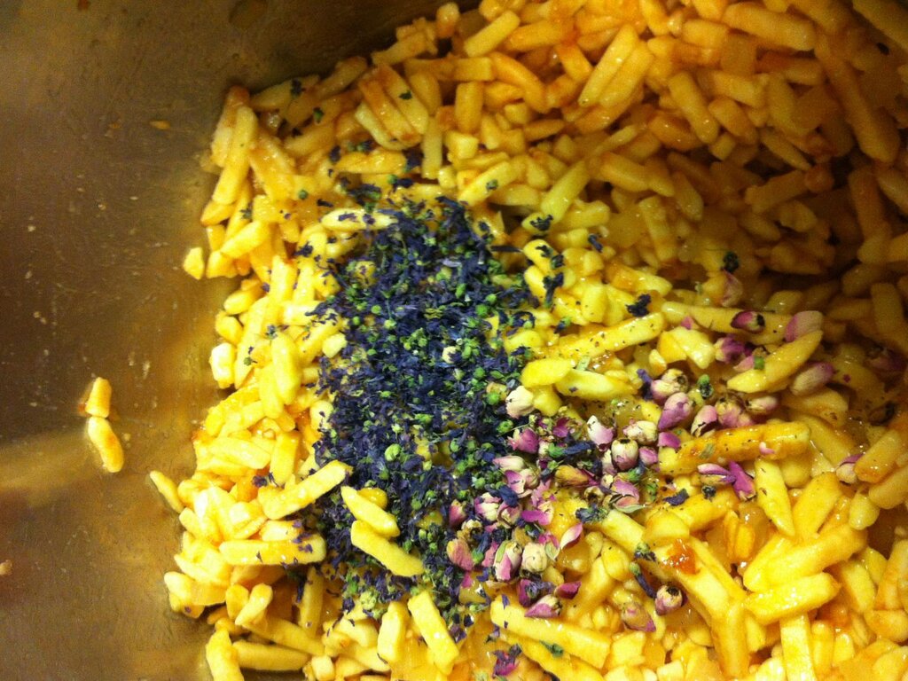 Mescolare le mele tagliate a dadini con marmellata e fiori di montagna.