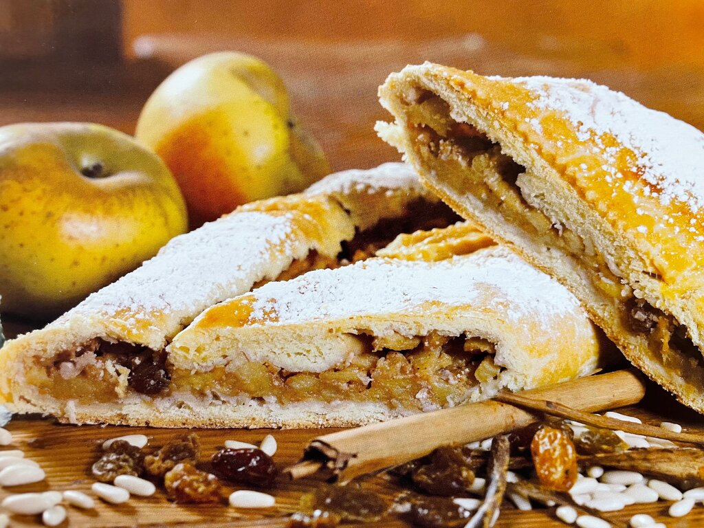 Sulla spianatoia impasta gli ingredienti della sfoglia e lascia riposare 10 minuti. Stendi la sfoglia sottile su di un ripiano infarinato dandole una forma rettangolare. Sbuccia e taglia le mele, aggiungi gli altri ingredienti al ripieno e disponi il composto sulla sfoglia. Arrotola con cura l'impasto, sigilla le estremità e spennella con un tuorlo sbattuto. Adagia su una placca ricoperta da carta forno e cuoci in forno preriscaldato a 175° per 45 minuti.