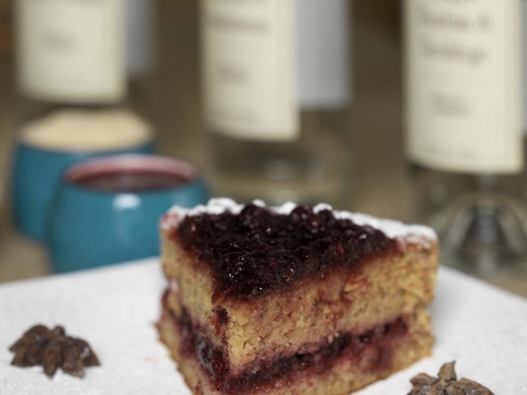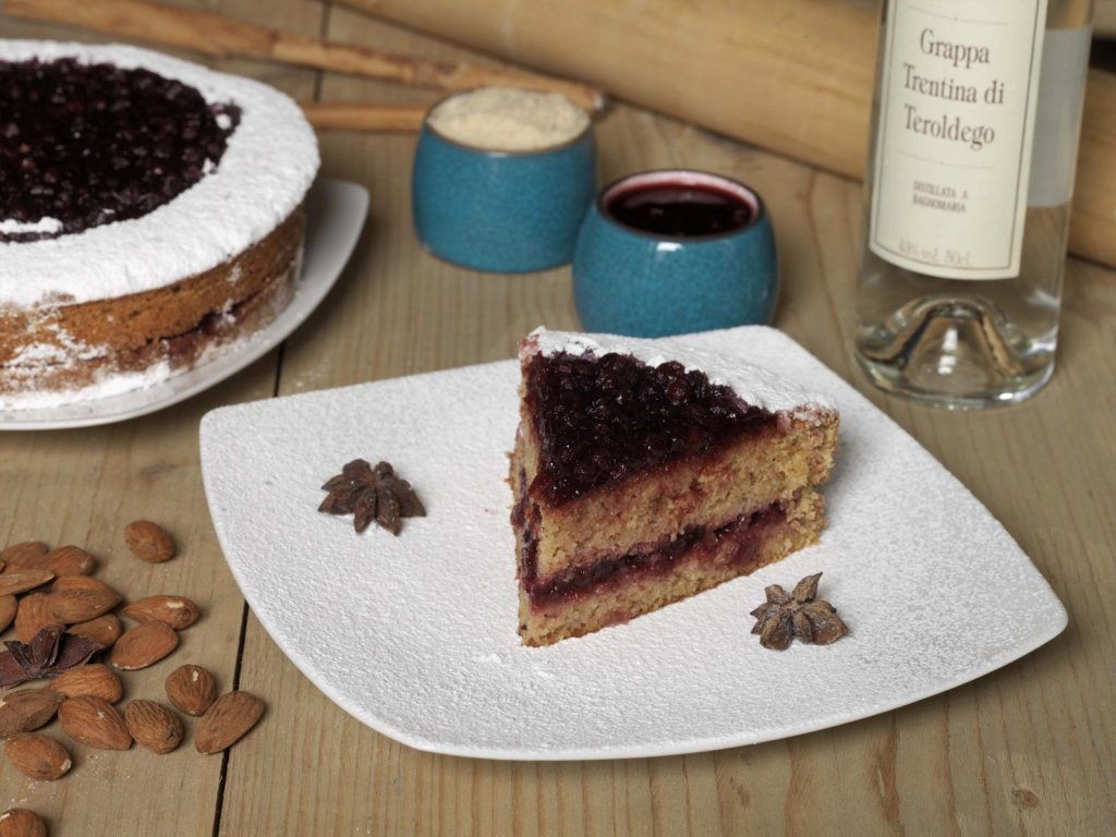 macinare finemente le mandorle e unire il resto degli ingredienti. Amalgamare bene, formando un impasto molto morbido, mettere in una tortiera unta (22 cm.) e cucinare in forno a 180° per 35/40 minuti. Una volta cotta e raffreddata tagliare a metà, bagnare abbondantemente con la grappa i 2 lati interni della torta, coprire il lato sotto con la marmellata, unire i 2 lati, spolverare con zucchero a velo lasciando pulito un cerchio centrale che verrà coperto con dell'altra marmellata.