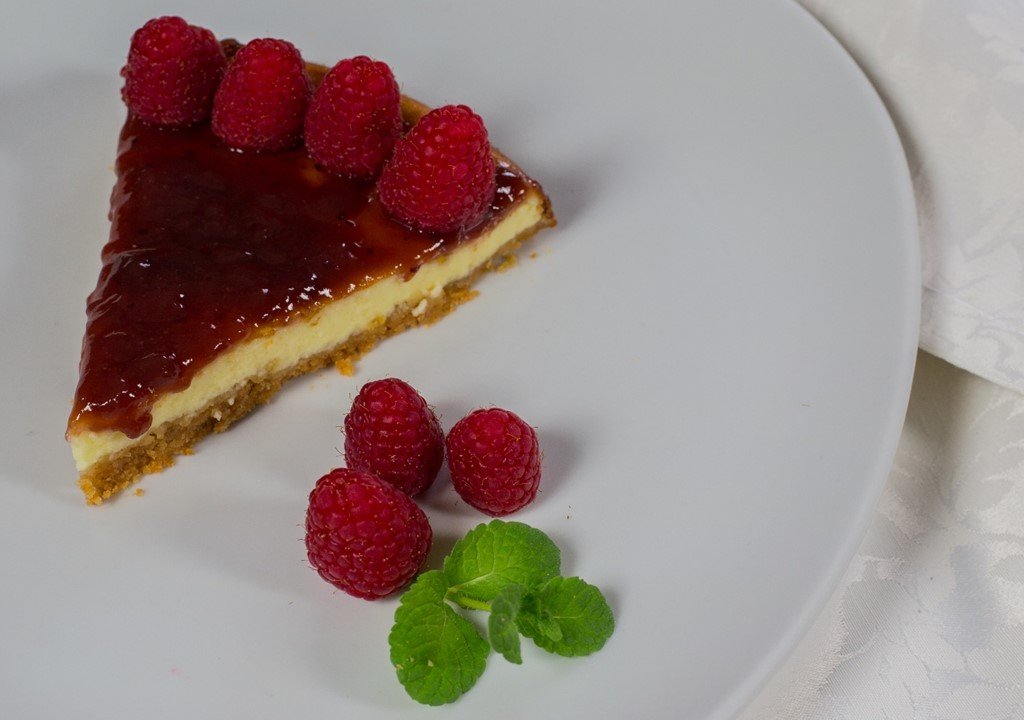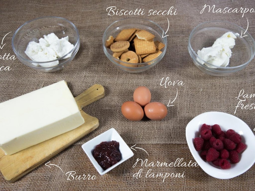 Versare la crema di ricotta e formaggi nella tortiera con i biscotti e metterla in forno preriscaldato a 140°C per circa 35 min. Trascorsi i 35 minuti, fare la prova dello stuzzicadenti prima di togliere la torta dal forno e, se necessario, cuocere ancora per 10 min. Quando la torta sarà fredda guarnirla a piacimento con uno strato di marmellata di lamponi e poi lamponi freschi!