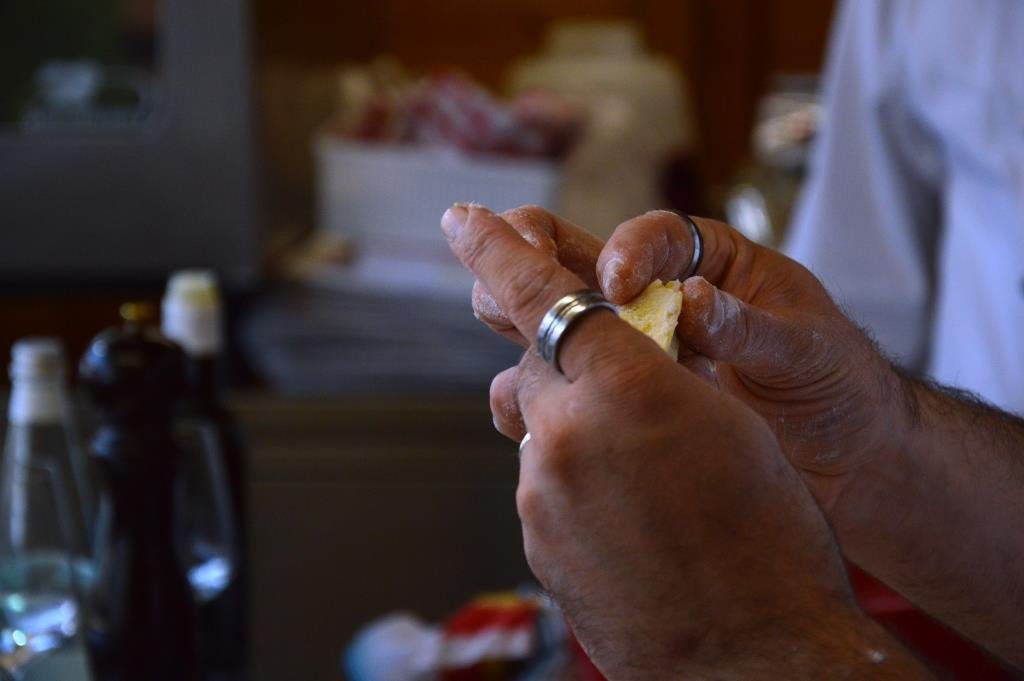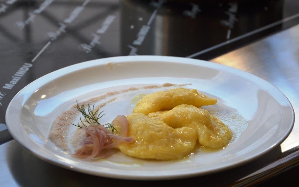 Tortelli di patate del Lomaso con salmerino, salsa di cipolle stufate al nosiola e olio extravergine di oliva DOP Garda Trentino