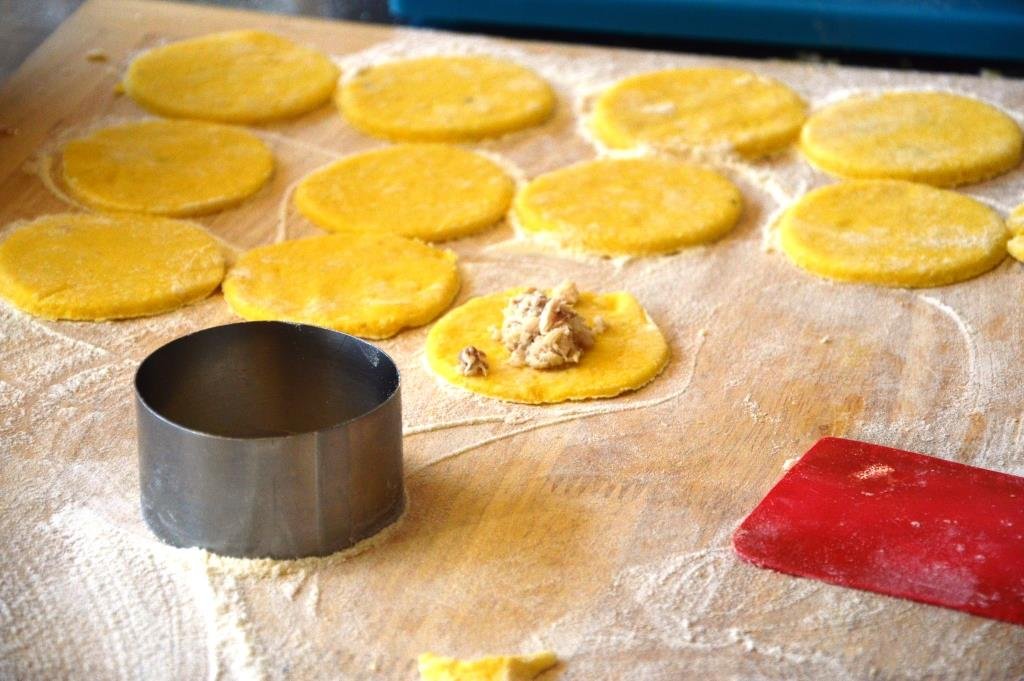 Stendere con un mattarello l'impasto di patate e, con uno stampo tondo, formare le basi per i tortelli.