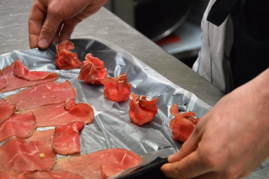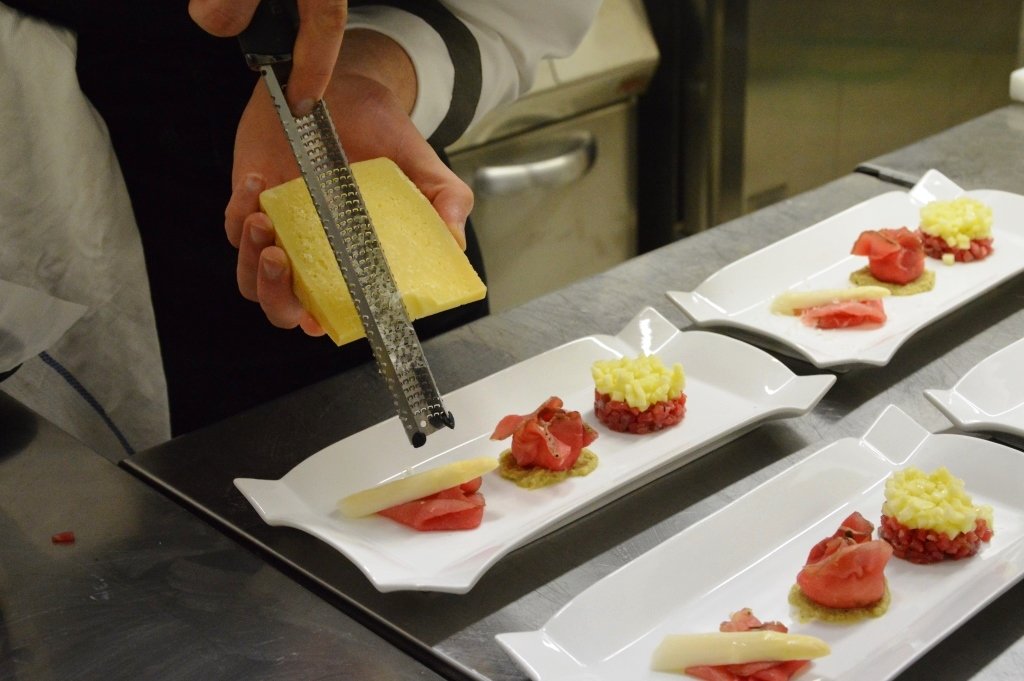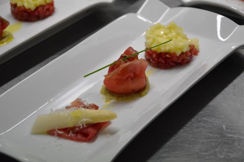 Trilogia di carne salada: carpaccio classico di carne salada con asparagi di Zambana e scaglie di Vezzena, tartare di carne salada e mele Golden e fagottino alle due ricotte su crema di broccolo di Torbole